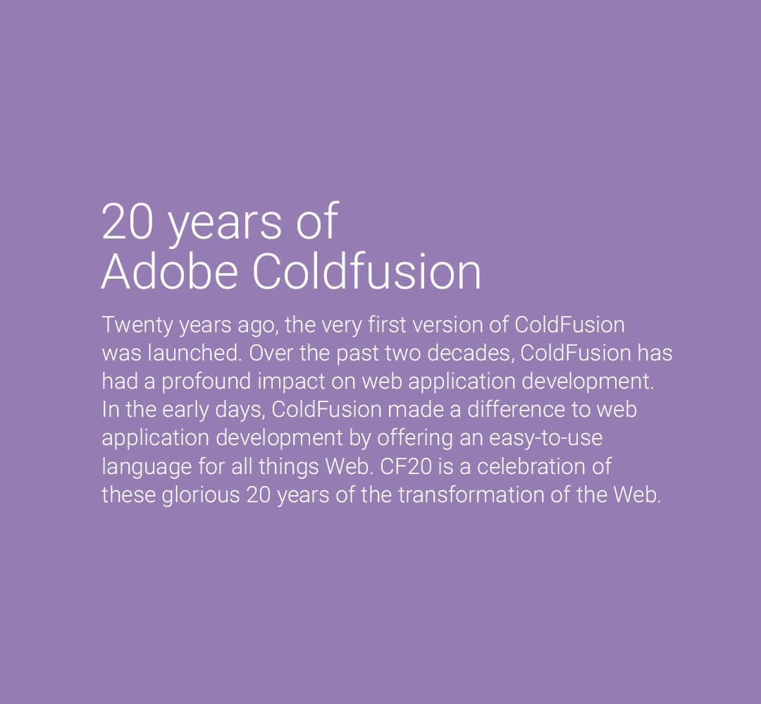 Twenty years ago, the very first version of ColdFusion was launched. Over the past two decades, ColdFusion has had a profound impact on web application development. In the early days, ColdFusion made a difference to web application development by offering an easy-to-use language for all things Web. CF20 is a celebration of these glorious 20 years of the transformation of the Web.